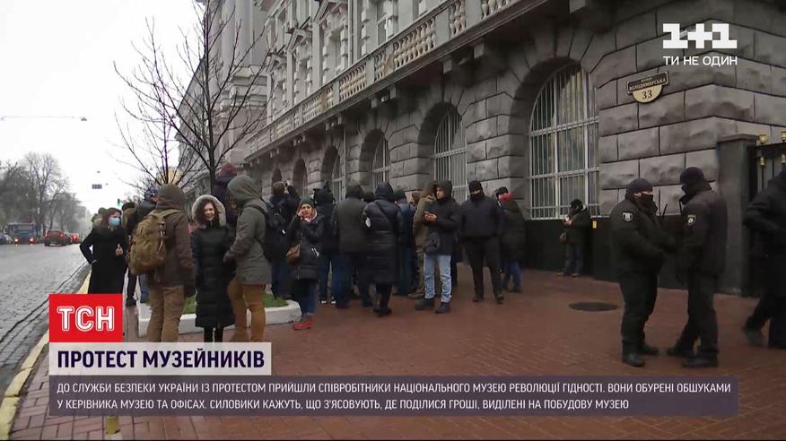 Протест под СБУ. Под столичное управление Службы безопасности Украины пришли возмущенные ученые и сотрудники Национального музея Революции Достоинства. Произошло это из-за вчерашних обысков дома у директора музея и в двух офисах. Силовики причиной следственных действий назвали то, что музей, на который правительство выделило более 100 миллионов гривен, так и не начали строить. Музейщики взамен считают, что преследование носит политический характер.