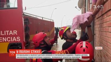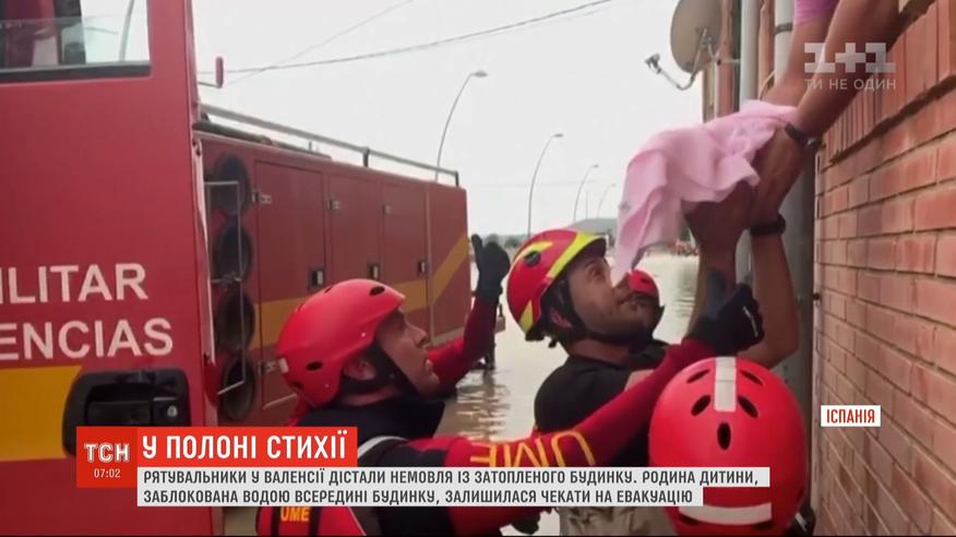 Семью ребенка высокая вода заблокировала в помещении. Чтобы не терять время, младенца, завернутого в полотенце, передали спасателям через окно. Сильнейшие за последнее столетие дожди заливают Испанию последние несколько дней. Потоки грязи затапливают улицы, припаркованные автомобили и дома.