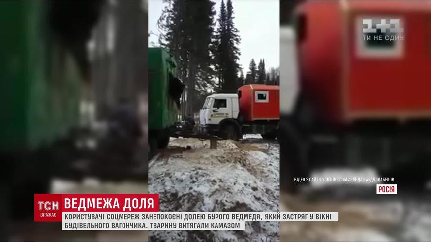 На севере РФ в окне вагончика для рабочих застрял медведь. Чтобы извлечь косолапого, понадобился КамАЗ и трос. Одни российские СМИ сообщают, что животному вкололи снотворное, освободили и отпустили, а другие, что его зарезали и из окна вытаскивали уже тушу. Видео завершается тем, как животное падает на землю и не шевелится.