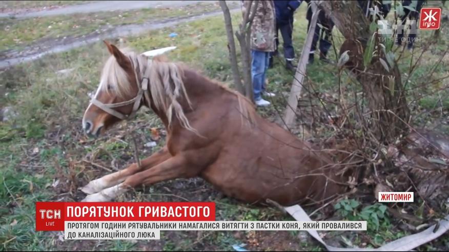 Спецоперация по спасению лошади. В Житомире животное провалилось в канализационный люк