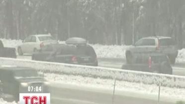 На севере прошли обильные снегопады, которые серьезно осложнили автомобильное движение - местами выпало почти до полуметра снега.