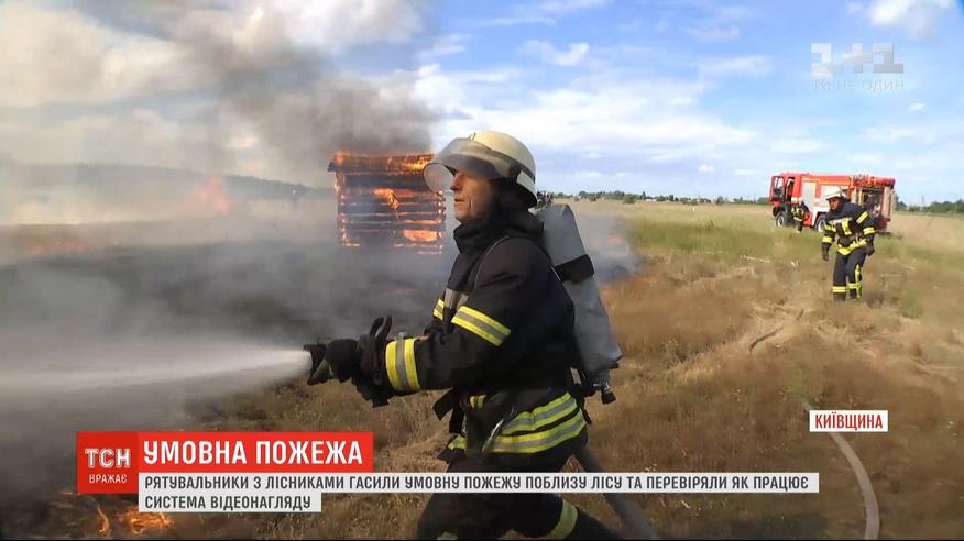 Охваченные огнем деревянные дома, столбы дыма и вой сирен: в Киевской области прошли учения спасателей. Несколько пожарных тушили огонь вблизи леса. Умышленно подожгли конструкции в виде деревянных домиков - огонь их охватил за считанные секунды, а вот на прибытие пожарных машин и обуздание понадобилось уже до 10 минут. Спасатели говорят: в реальных условиях огонь жилыми домами распространяется так же стремительно, а привести к беде может брошенная спичка в поле или лесу рядом - так было, например, в этом году вблизи зоны отчуждения. Помогать выявить лесные пожары должна система видеонаблюдения, которая установлена в лесхозах Киевской области: камеры на башнях "бьют" на десятки километров и в случае задымления диспетчер направляет лесников и пожарных.