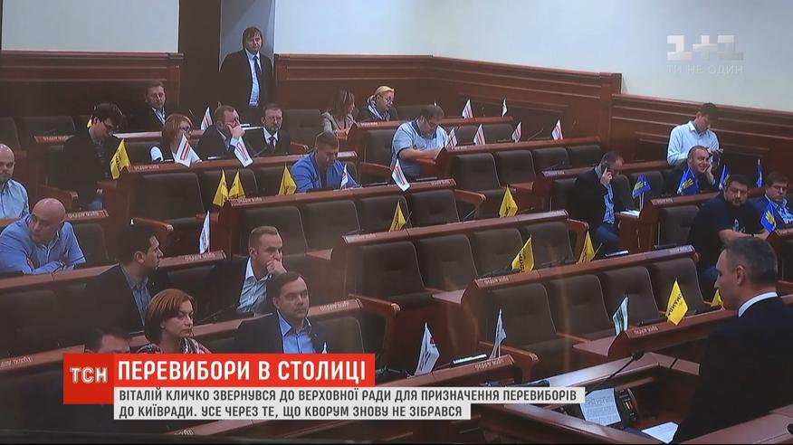 Роспуска Киевсовета просит у парламента Виталий Кличко. Причина - очередное сорванное заседание. Столичные избранники уже четвертый месяц не могут собраться. Из 110 человек в зале сегодня зарегистрировались только 38. Одни объясняют - пропустили заседание, поскольку имеют серьезные претензии к столичной власти. Другие утверждают - Кличко потерял контроль над городом. В конце концов столичный глава написал обращение в Верховную Раду.