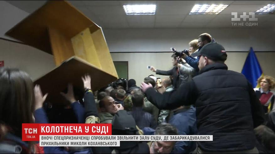 Так активисты пытались помешать зайти силовикам в зал суда. Напомним, 2 дня назад произошел конфликт между Коханивским и другим добровольцем с "Правого сектора" Русланом Качмалою. Ссора закончилась стрельбой. Вчера вечером Коханивскому должны были избрать меру пресечения, но заседание закончилось стычками и погромом.