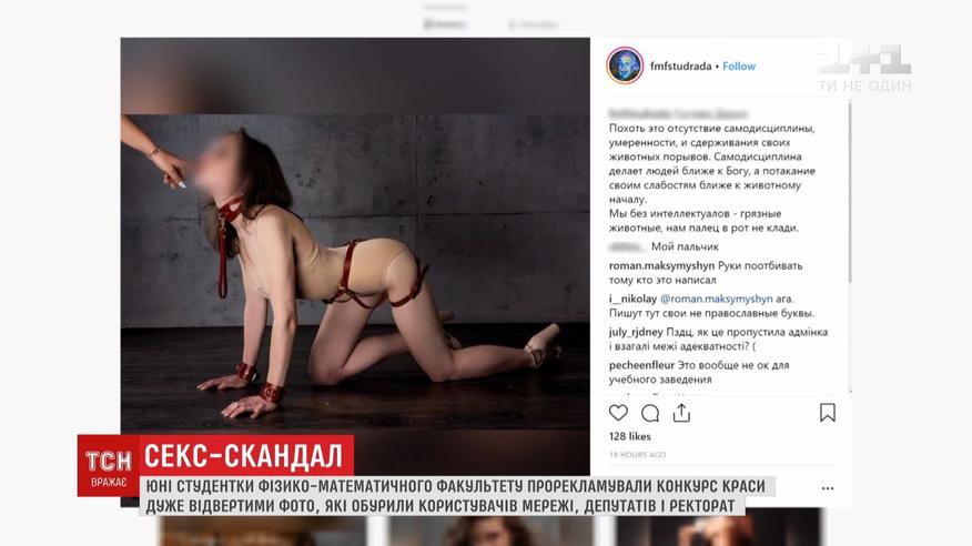 Cекс-скандал в Киевском политехническом институте. Полуобнаженные студентки физико-математического факультета снялись в откровенных позах, выложили фотографии в соцсеть и вызвали этим волну возмущений. Чтобы проанонсировать факультетский конкурс красоты, девушки, в том числе несовершеннолетние, разместили в интернете фотосессию и промовидео с пометкой, что оно может быть неприемлемым для просмотра. Некоторые пользователи увидели в изображениях элементы порнографии.