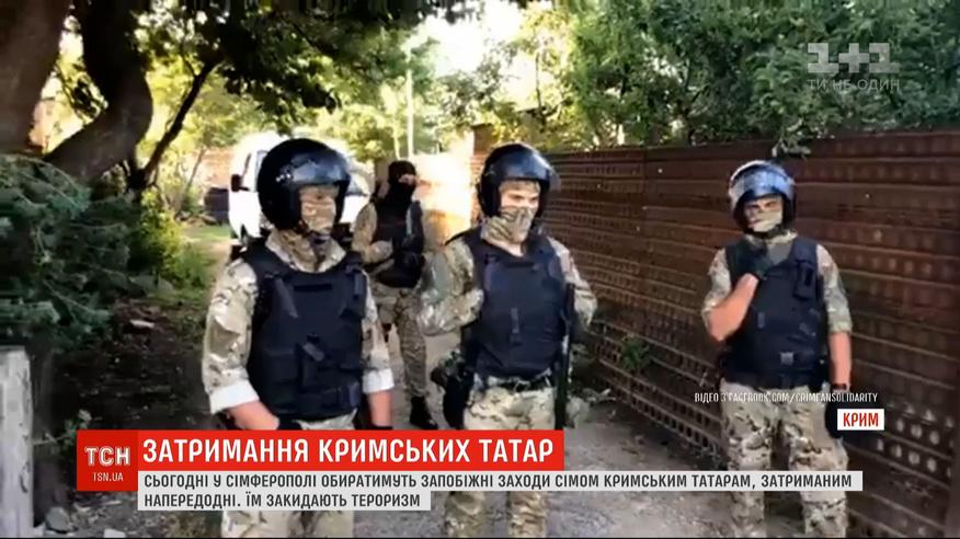 Меры предосторожности крымским татарам, которых российские власти обвиняют в терроризме, сегодня будет выбирать оккупационный "суд" в Симферополе. Одному из крымских татар присудили домашний арест еще вчера. Задержали их накануне после масштабного рейда по четырем районам аннексированного полуострова. В украинском МИД тем временем заявили, что оккупанты репрессируют жителей Крыма по религиозному признаку.