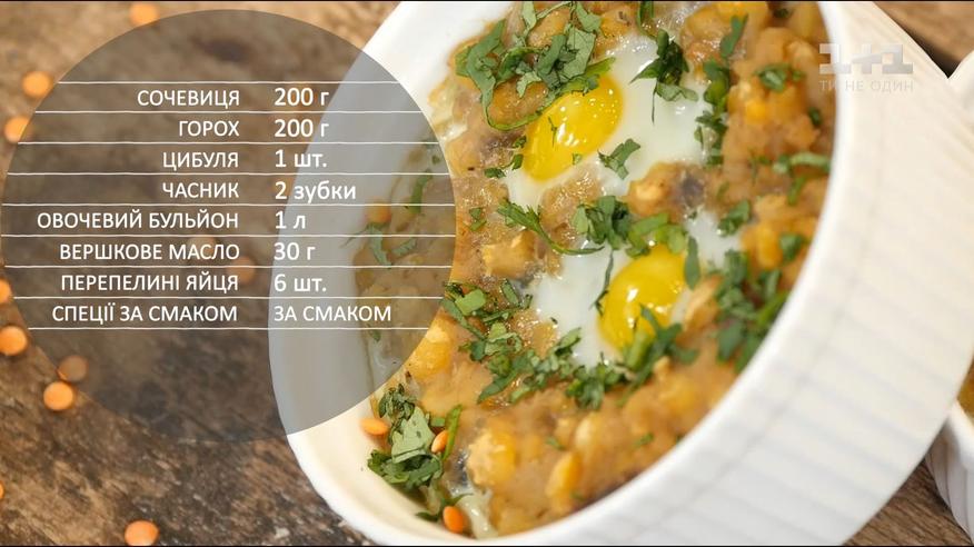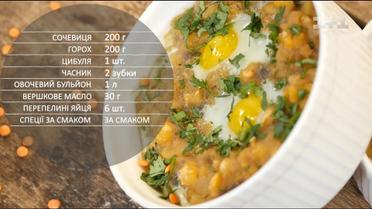 Сочевица - суперпопулярный продукт сегодня. И полезный, кстати. У Руслана Сеничкина есть замечательный рецепт с ней - записывайте, вам понадобится: сочевица - 200 г, горох - 200 г, лук - 1 шт .. чеснок - 2 зубка, овощной бульон - 1 л, сливочное масло - 30 г., перепелиные яйца - 6 шт., специи по вкусу