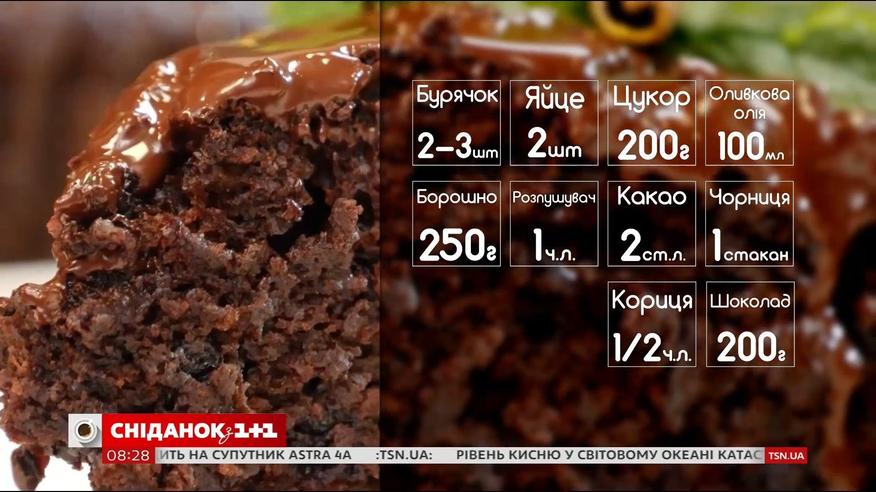 Из свёклы можно сделать не только традиционный борщ или винегрет, но и вкусный десерт! Записывайте рецепт от Эдуарда Насырова, нам понадобится: свёкла - 2-3 шт, яйцо - 2 шт, сахар - 200 г, оливковое масло - 100 мл, мука - 250 г, разрыхлитель - 1 ч. Л., Какао - 2 ст. л., черника - 1 стакан, корица - 1/2 ч. л., шоколад - 200 г.