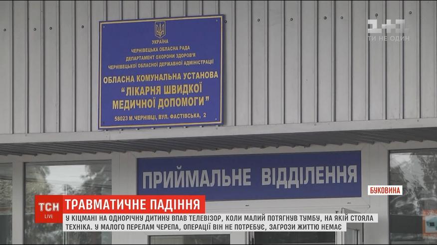 С Кицмани в больницу в Черновцах малыша доставили с переломом черепа. По данным полиции, ребенок играл у тумбы, на которой стояла плазма, открыла дверцу и потянула их на себя, из-за чего телевизор перевернулся на мальчика, ударив его по голове. Маленький пациент в состоянии средней тяжести.