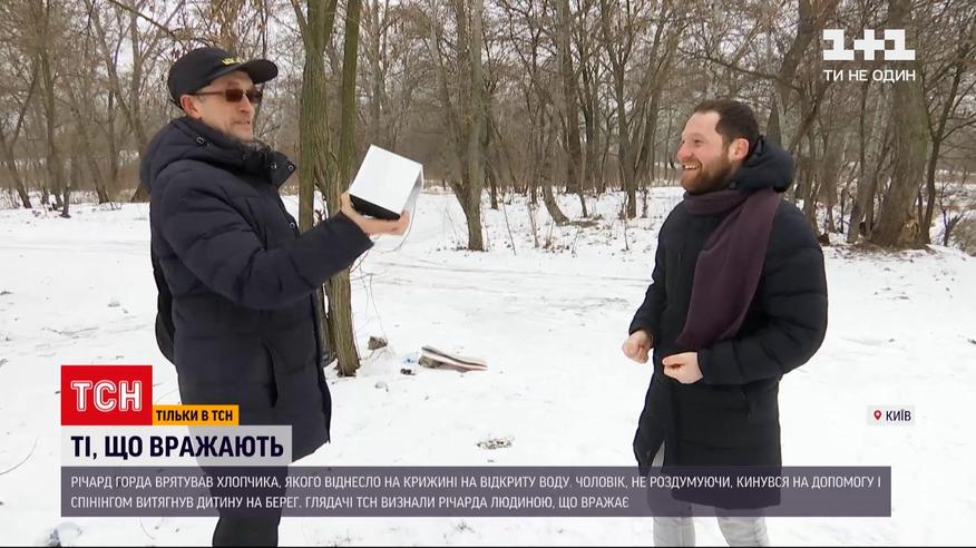 Поступок, поразивший всю страну. Киевлянин Ричард Горда спас мальчика, которого на льдине унесло на открытую воду. Мужчина не раздумывая бросился на помощь и спиннингом вытащил ребенка на берег. Это произошло еще в марте 21-го. А - каждый год наша редакция проводит награждение премией - "Ті, що вражають". Мы собираем истории наиболее запомнившихся людей. На этот раз среди номинантов был и этот герой