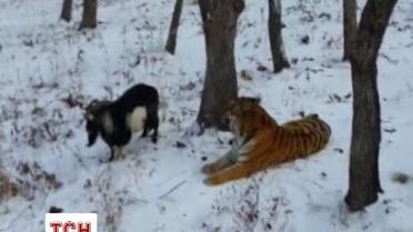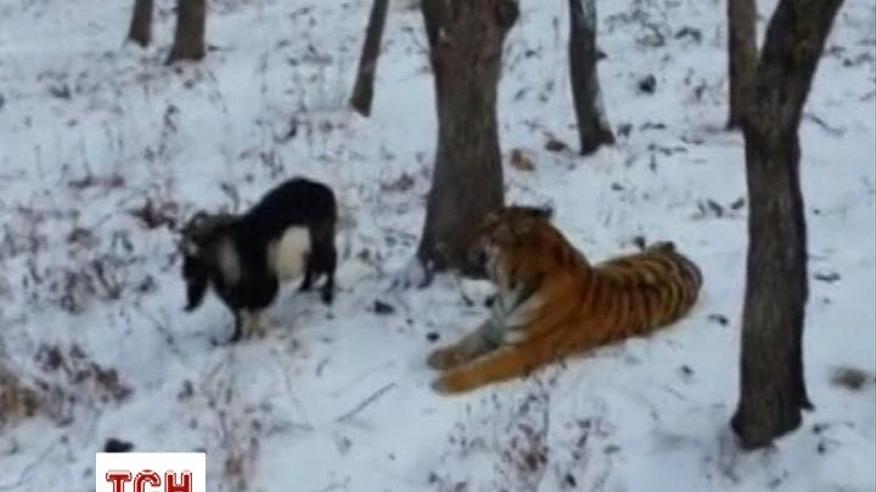 Тигр подружился с козлом, которого привезли хищнику на обед
