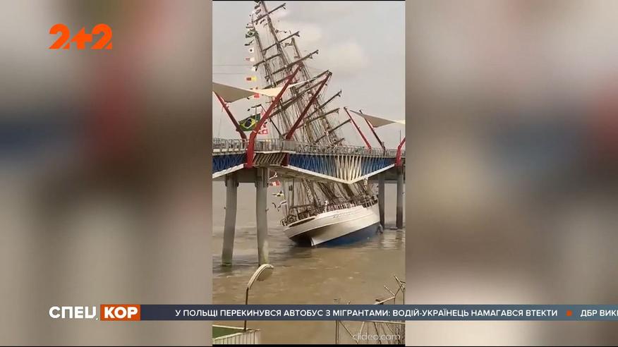 Сложности морского припортового маневрирования. Трехмачтовый парусник ВМС Бразилии как-только вышел из порта и сразу попал в беду. Судно протаранило пешеходный мост. Полные выпуски смотрите на 1+1 video