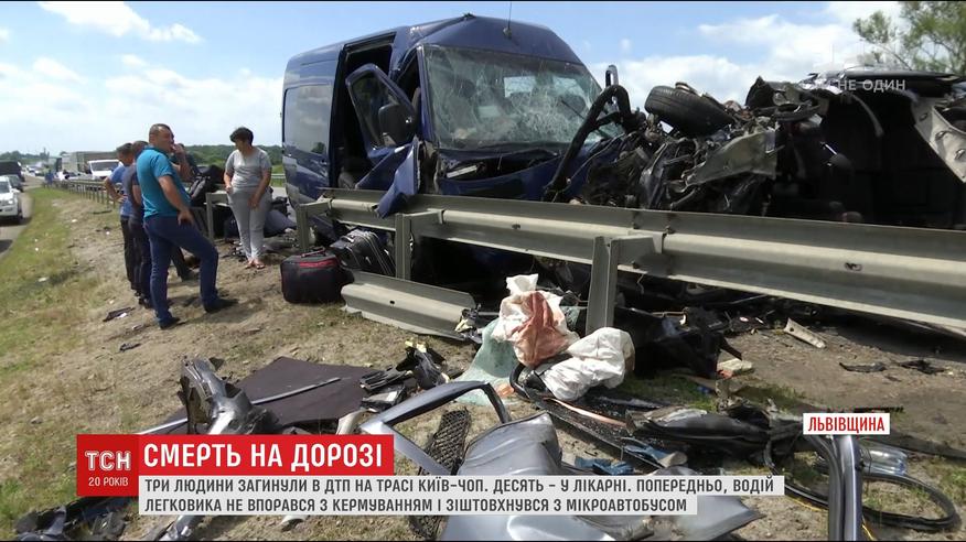 15 человек получили травмы, 10 пострадавших госпитализированы. Утром на Львовщине не разминулись легковушка и микроавтобус. По предварительным данным, именно водитель легковушки не справился с управлением, выехал на встречную полосу и лоб в лоб столкнулся с автобусом. Мужчина и две пассажирки погибли на месте.