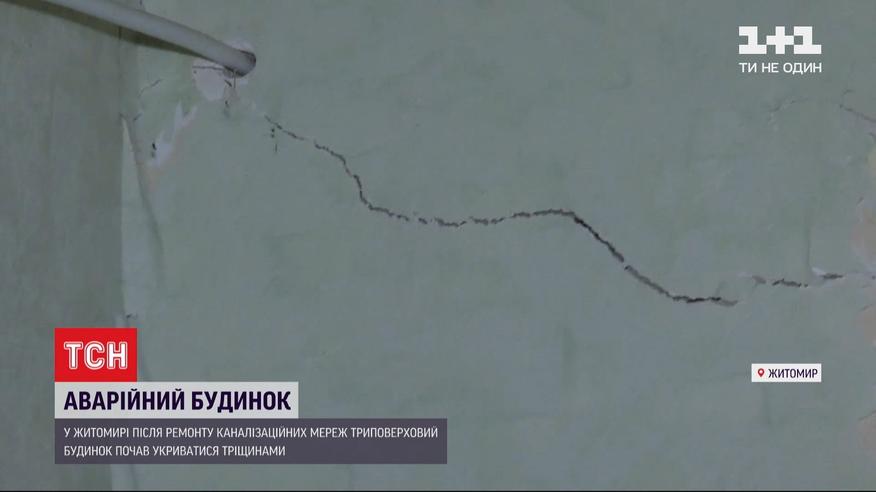 У Житомирі розвалюється триповерховий житловий будинок. Тріщини на стінах та стелі та просідання підлоги - мешканці почали помічати після ремонту каналізаційних мереж, який зробили комунальники. 63 родини бояться ночувати в аварійній будівлі й масово виїжджають до родичів. А от комісія міськради, яка приїхала перевіряти скарги людей, катастрофи не побачила.