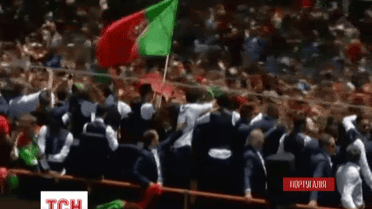 Чемпионов Европы еще в аэропорту ждала целая армия фанатов. Самолет победителей встретили фонтаном из брандспойтов - цвета национального флага, красного и зеленого. Желанный кубок вынесли капитан команды Криштиану Роналду и тренер.