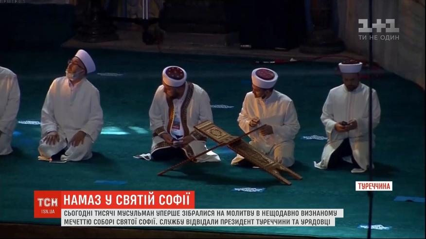Первый за 86 лет намаз - тысяч мусульман пришли на молитву в старинный собор, который Турция недавно признала мечетью. Президент страны Реджеп Эрдоган и министры вместе с несколькими сотнями людей зашли внутрь. Во время массового мероприятия им пришлось надеть маски. Христианские мозаики и фрески на время намаза закрыли специальными шторами. Тысячи верующих собрались на молитву и под зданием. Из-за ажиотажа городским властям пришлось ограничить доступ верующих в район, чтобы те, кто уже пришел, имели место для социальной дистанции. Ожидается, что продлится молитва завтра.