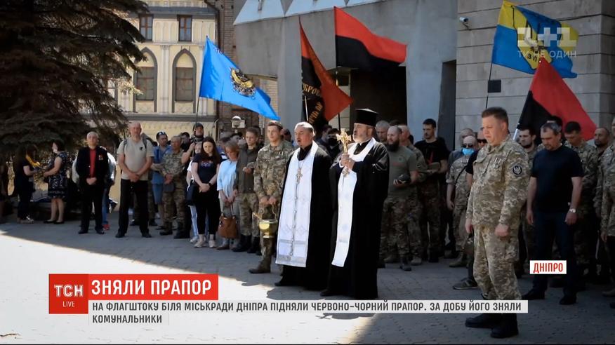 Утром повесили, а на следующий день сняли. В Днепре возле городского совета внезапно взвился красно-черный флаг. Ветераны войны на востоке провели акцию у флагштока и освятили флаг. Но на следующий день без всяких объяснений знамя убрали коммунальщики. Что это за акция, чиновники не комментируют.