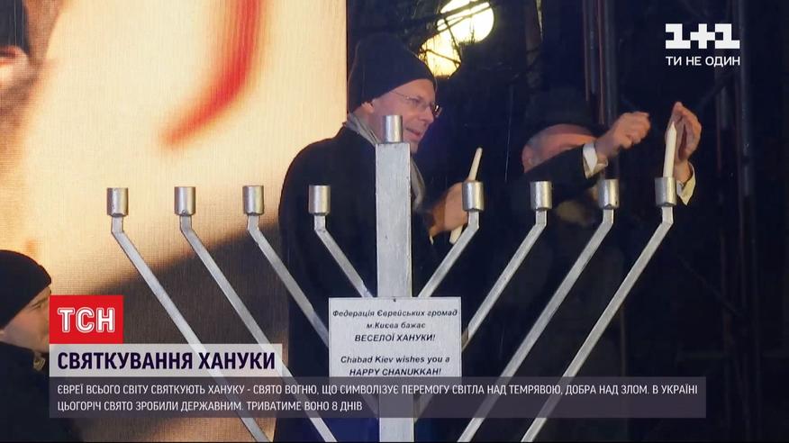 Счастливой и веселой Хануки желают друг другу сегодня евреи всего мира. В Украине в этом году иудейский праздник огня празднуют впервые в статусе государственного праздника. Продлится он восемь дней. Первые ханукальные свечи зажгли сегодня и в столице. Ледяной дождь помешал членам столичной еврейской общины сделать это на улице, поэтому Ханукию зажгли в помещении.