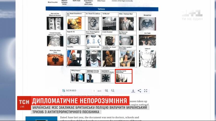 Украинское МИД призывает полицию Великобритании изъять тризуб - официальный Герб Украины - из антитеррористического пособия. Документ на прошлой неделе разослали британским правоохранителям и медицинским работникам в рамках программы борьбы с терроризмом и экстремизмом. Украинский герб поместили в раздел "знаки ультраправых" и в разделе "тату".