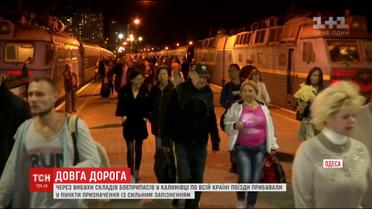 Семнадцать вагонов выехали из столицы в 21:15 во вторник, а в Одессе были только в половине девятого вечера среды. Около семисот человек стали заложниками чрезвычайной ситуации на военном складе под Винницей. Таких поездов, пущенных в объезд опасного участка, вчера в Украине было 47. Время задержки прибытия к местам назначения колебался от двух до двенадцати часов.