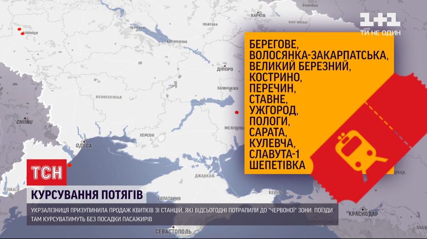 "Укрзализныця" приостановила продажу билетов из станций, которые отныне попали в "красную" зону. Всего их 12. Пока эпидемическая ситуация не улучшится, поезда там будут курсировать без посадки пассажиров. А высадку будут делать в установленном порядке. Кроме того, из-за стремительного распространения коронавируса, изменился маршрут следования шести поездов.