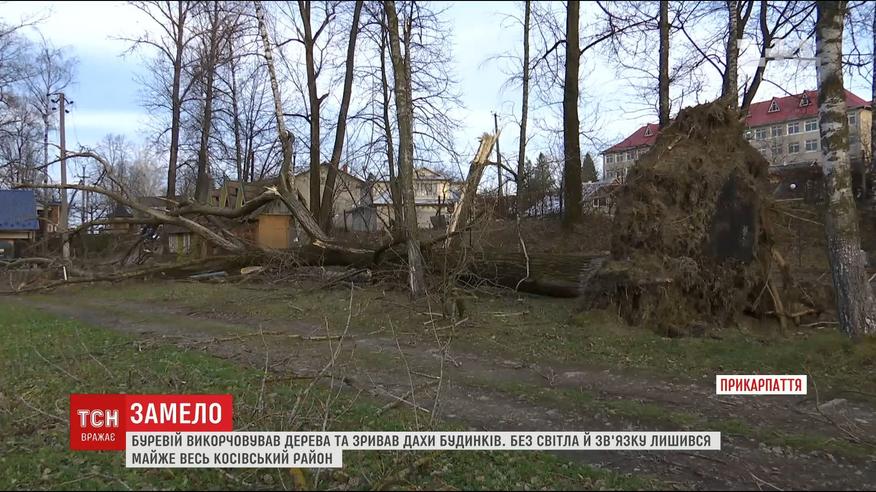 В эпицентре непогоды оказался горный Косовский район. Через час сильный ветер сорвал крыши домов, выкорчевал деревья и оставил без света и телефонной связи почти весь район. Убытки чиновники еще считают. Но предполагают - речь идет о менее 5 миллионов гривен.