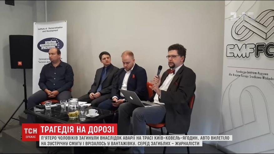 Политологи Александр Никоноров, Алексей Куренной, Александр Маслак, журналист Владимир Карагяур и общественный активист Сергей Попов. ДТП произошло утром на трассе Киев-Ковель-Ягодин. Все пятеро возвращались одним авто в Киев из Варшавы, где были на международной конференции по вопросам "гибридной войны".