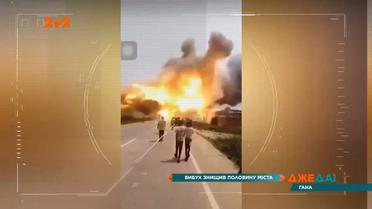 В африканской Гане, после столкновения с мотоциклом, в воздух взлетел грузовик. После взрыва в пустыню превратилась территория величиной с небольшой поселок. 500 домов просто сравняло с землей. 17 погибших и более полусотни пострадавших. Полные выпуски смотрите на 1+1 video