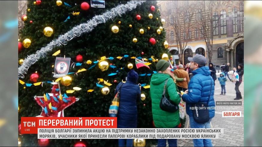 Болгарская полиция остановила акцию в поддержку украинских моряков. Активисты собрались в Софии у елки, которую городу недавно подарила Москва. Участники акции украсили дерево плакатами и разместили под ним бумажные кораблики, требуя освободить незаконно задержанных Россией в Керченском проливе украинцев.