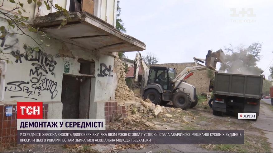 В центре Херсона сносят старую двухэтажку. 8 лет она пустовала и стала аварийной. Там собиралась асоциальная молодежь и бездомные. Жители соседних домов говорят - не раз обращались к городским властям, чтобы там навели порядок, но тщетно. И вот сегодня туда приехал экскаватор.