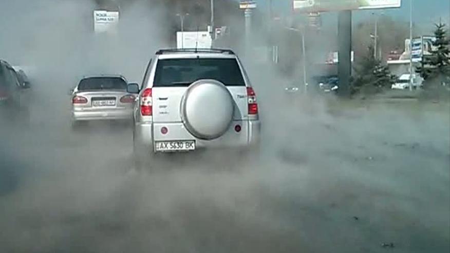 В Киеве в районе моста Патона прорвало теплотрассу, в результате чего автомобили на этом участке дороги вынуждены были двигаться в кипящей воде.