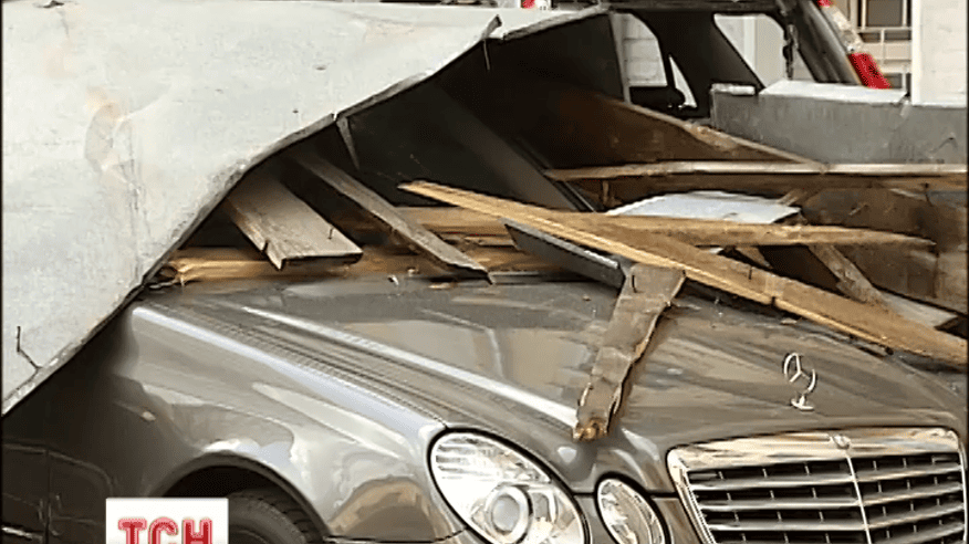 Жестяное покрытие сорвалось вместе с деревянными опорами. Куски металла завалили 5 автомобилей, которые были припаркованы во дворе. Наиболее поврежден новый мерседес, который не был застрахован. Жительница дома, рядом с которой упало покрытие, спаслась.