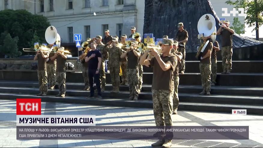 Американская музыка под открытым небом. Таким образом, с Днем Независимости жителей США поздравили во Львове. В центре города на площади возле памятника Тарасу Шевченко вернувшийся с фронта военный оркестр устроил концерт-дефиле. Музыканты исполнили гимн Соединенных Штатов, а впоследствии – и славен Украины. И смиксовали пять известных музыкальных композиций - американских и украинских. На месте импровизированного концерта развернули два флага – Соединенных Штатов и сине-желтый. Таким образом, говорят военные музыканты, хотят отблагодарить американцев за поддержку оружием и за убежище для украинских беженцев.