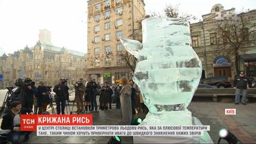 В центре столицы установили 3-метровую ледяную рысь, которая при плюсовой температуре тает