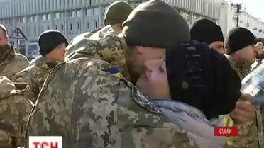 В центре Сум с почестями встретили бойцов, почти год защищавших позиции в Ясиноватой и Авдеевке