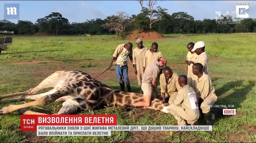 Животное случайно намотала на шею провод, который в конце концов мог его задушить. Впрочем, самое сложное было не попасть транквилизатором, а уже после этого аккуратно уложить его на землю. Когда это удалось, проволку срезали, жирафа подняли на ноги и отпустили.