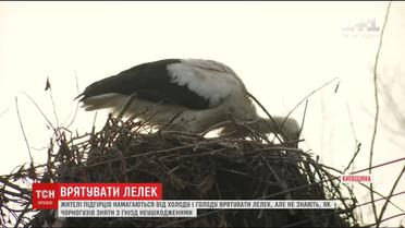 В деревне близ Киева люди спасали двух аистов, которые не улетели в теплые края
