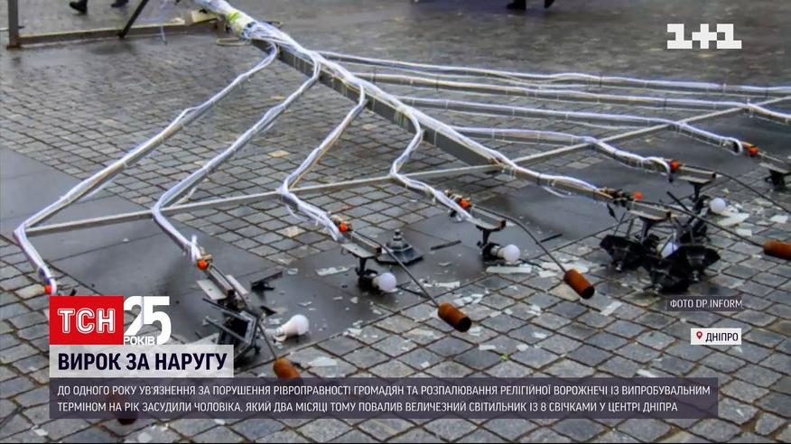 Приговор за свергнутую ханукию. В Днепре суд к одному году заключения за нарушение равноправия граждан и разжигание религиозной вражды приговорил молодого человека. Однако за решетку осужденный не уйдет, потому что имеет год испытательного срока. Во время заседаний свою вину он признал и извинился за причиненное у еврейской общины. Огромный светильник свалили в центре Днепра два месяца назад. Все зафиксировали камеры слежения. Светильник с восемью свечами к празднику Хануки там устанавливают несколько лет подряд.