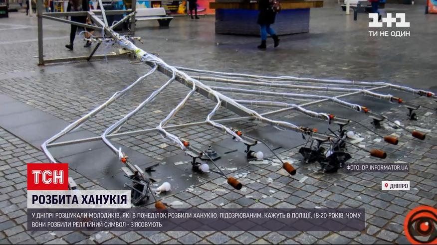 Огромный светильник установили на центральной площади города до одного из самых главных еврейских праздников – Хануки. В понедельник на рассвете молодые люди подошли к нему, сначала выключили лампочки, а потом просто повалили светильник и скрылись. Все зафиксировали камеры слежения. Подозреваемым от 18 до 20 лет.