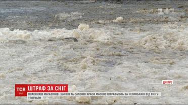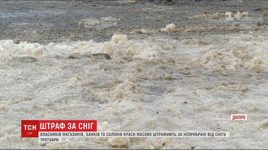 В Днепре массово штрафуют магазины, банки, кафе и салоны красоты, не убирают снег у себя. Наказание - 1700 гривен. Разгильдяев насчитали уже три сотни. По утвержденным нормам, владельцы и арендаторы помещений должны расчищать и посыпать тротуар на пять метров от своих фасадов.