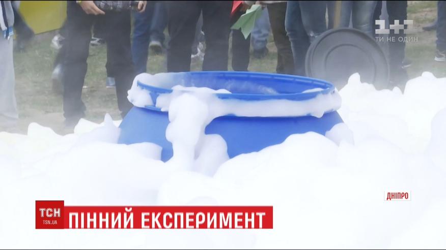 Пузырчатая масса достигла многометровой высоты. Экспериментаторы успели отбежать, поэтому остались сухими и невредимыми. Для такого эффекта, студенты местного университета смешали в бочке жидкость для мытья посуды и некоторые препараты, которые можно найти в обычной домашней аптечке.