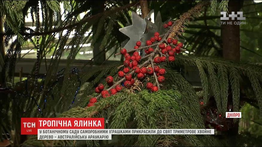 Украшения изготовили специальные из украинских шишек, желудей и кизила. Дерево родом из Австралии украинских морозов не любит, поэтому растет только в теплых помещениях. Растение хвойное, и ее веточки, в отличие от елочных, а не колются.