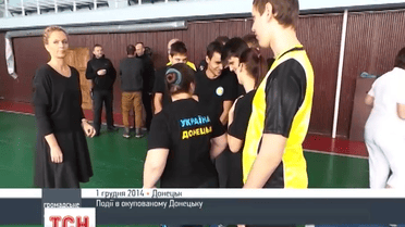 Они пришли на встречу с одним из руководителей самозванной ДНР Денисом Пушилиним в одежде с надписями "Донецк - это Украина".