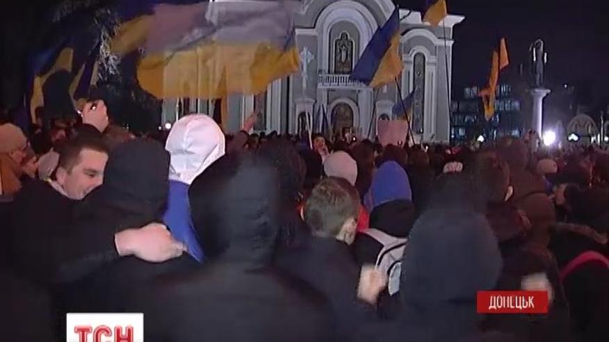 Около двух тысяч дончан под желто - голубыми флагами собрались на митинг единства. И заявляли - Украина единственная и неделимая . Призвали учесть это и россиян.