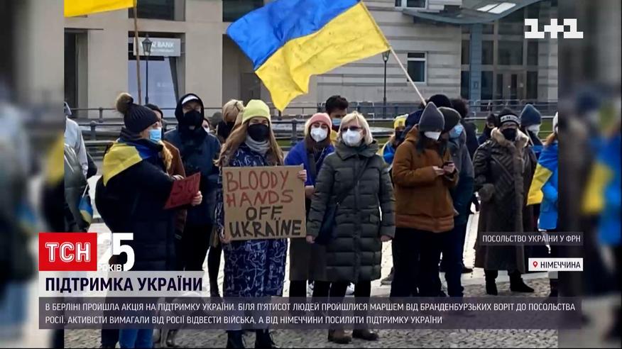 В Дрездене, Кельне и Берлине одновременно прошли акции протеста против войны в Украине. Протестующие призвали правительство Германии остановить Россию и не допустить войны в Украине. Демонстрация прошла под лозунгом: "У войны нет границ". В Берлине собралось около полутысячи человек. К украинским присоединились немцы, белорусы, грузины, поляки и эстонцы. Началась акция у Бранденбургских ворот и продолжилась маршем по улицам Берлина с остановкой у посольства Российской Федерации. Подобную акцию украинская диаспора планирует провести и в Мюнхене.