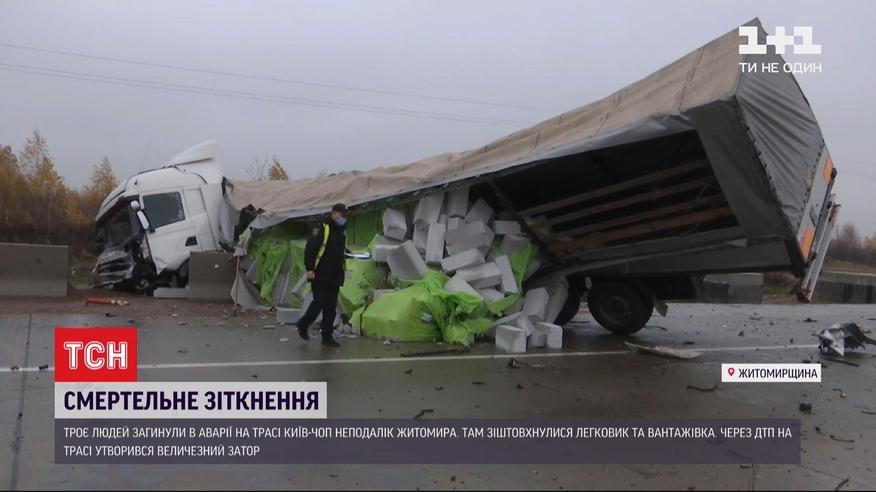Крупная авария под Житомиром. На трассе "Киев-Чоп" столкнулись легковушка и грузовик. Три человека погибли на месте. На трассе из-за аварии образовалась пробка.