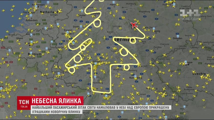С немецкого Гамбурга вылетел крупнейший пассажирский самолет мира с удивительной траекторией. Пилот делал над Германией неожиданные повороты, выписывал круги. Кроме того, на фюзеляже лайнера не было ни одной надписи. Только за раскрашенным хвостом можно было догадаться, что самолет принадлежит авиакомпании "Эмирейтс". После звонка в офис компании секрет раскрылся. Оказалось, что компания-производчик делала обкатку нового лайнера. А необычная траектория сложилась в рисунок украшенной игрушками елки.