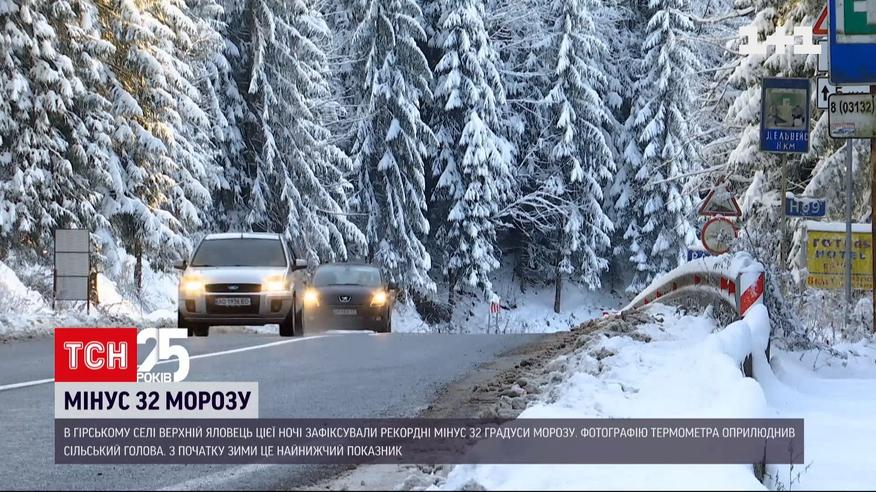 В горном селе Верхний Яловец этой ночью зафиксировали рекордные минус 32 градуса мороза. Фотографию со столбиком термометра обнародовал глава территориального общества. Говорит – с начала зимы – это самый низкий показатель. Но трескучие морозы скоро закончатся. По прогнозам синоптиков в ближайшее время по всей Украине будет небольшое потепление с мокрым снегом.