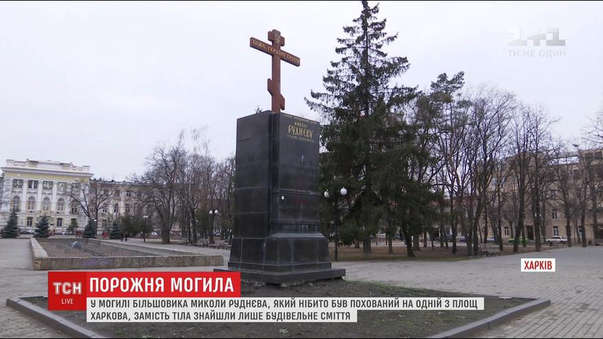 Под плитой с именем революционера нашли только строительный мусор. Руднев возглавлял большевистские войска, которые разоружили армию УНР. Убили его в 1918 году под Царицыным, там и похоронили. А уже через год вроде перезахоронили в Харькове на площади, которую назвали в его честь и установили там его памятник. 2014 монумент снесли, а площадь переименовали в Площадь Героев Небесной сотни. Когда же по просьбе активистов решили перезахоронить тело революционера, выяснилось, что в могиле его нет.