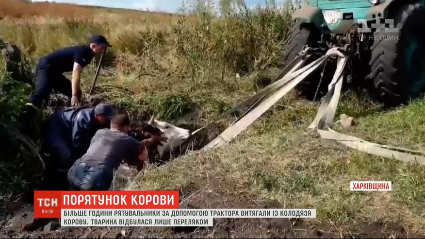 За рога бандажом и трактором вытаскивали, будто репку. Так с колодца в Харьковской области спасатели доставали корову. С просьбой спасти телочку с заброшенного двухметрового колодца позвонил ее хозяин. Спасатели обмотали корову веревками и цепями. Пока втроем вовсю выталкивали животное, хозяин наверху медленно тянул ее собственным трактором. Спасательная операция длилась около часа. Корова цела и невредима, но сильно испугалась.